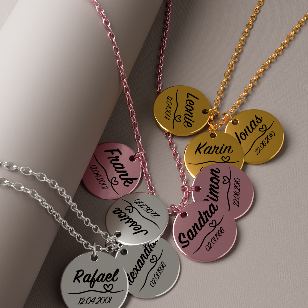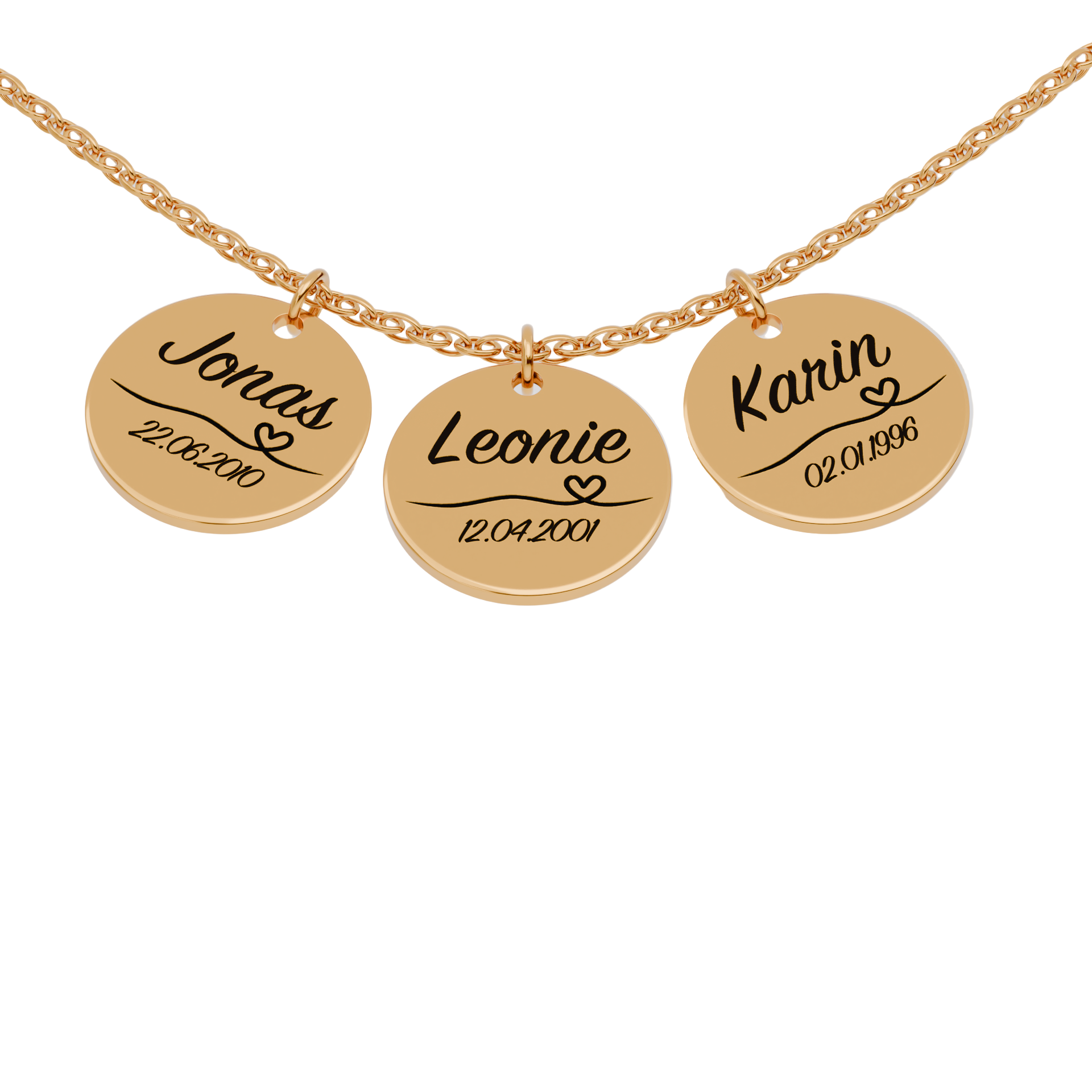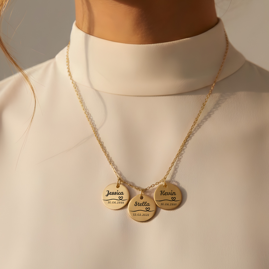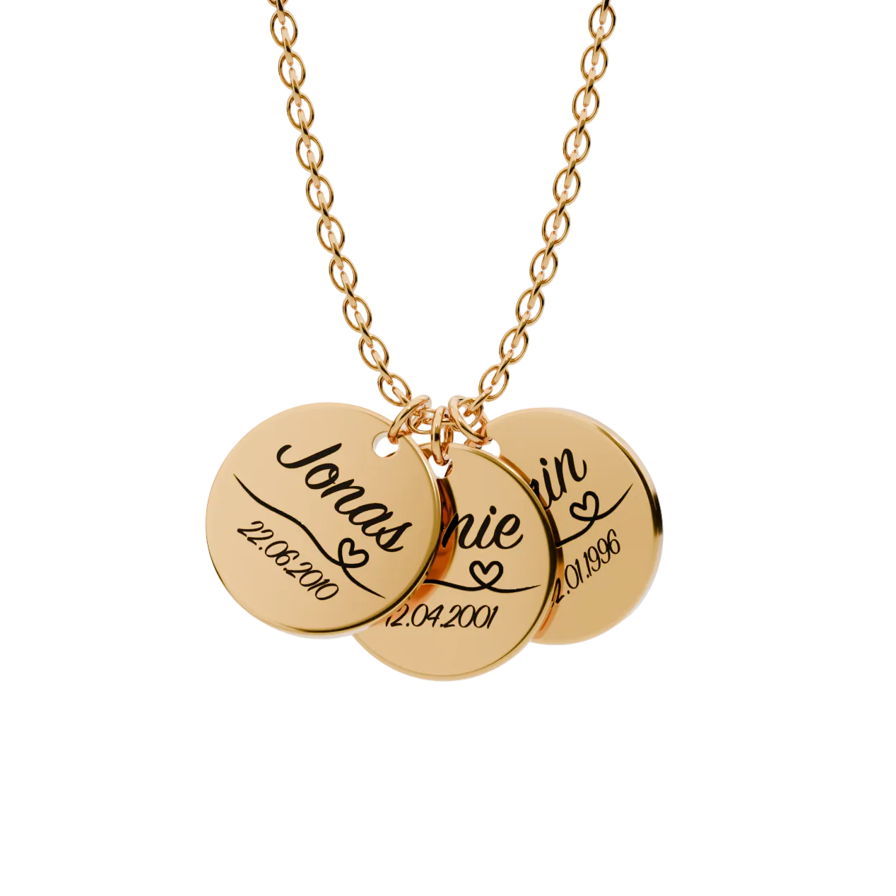 Diese elegante Halskette vereint zeitloses Design mit persönlicher Bedeutung. An einer feinen Kette hängen drei runde, hochwertig polierte Anhänger, die individuell mit Namen und wichtigen Daten graviert werden können – ein Schmuckstück, das Erinnerungen für immer festhält.